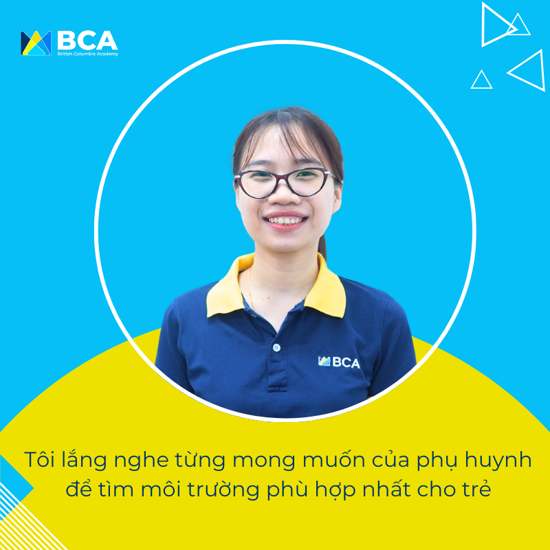 Cảm ơn ba mẹ thật nhiều vì đã tin tưởng gửi gắm các con học tại BCA. Tại đây, chúng tôi luôn cố gắng tạo ra một môi trường học tập đáp ứng các nhu cầu đặc biệt của từng trẻ nhằm giúp con khám phá được tiềm năng của bản thân, đồng thời giúp các con cùng nhau trải nghiệm môi trường đa văn hóa thông qua việc tương tác với bạn bè và giáo viên từ nhiều nơi khác nhau trên thế giới. BCA luôn tôn trọng sở thích cá nhân của trẻ, khuyến khích các con khám phá và học hỏi bằng chính sự tò mò của mình.